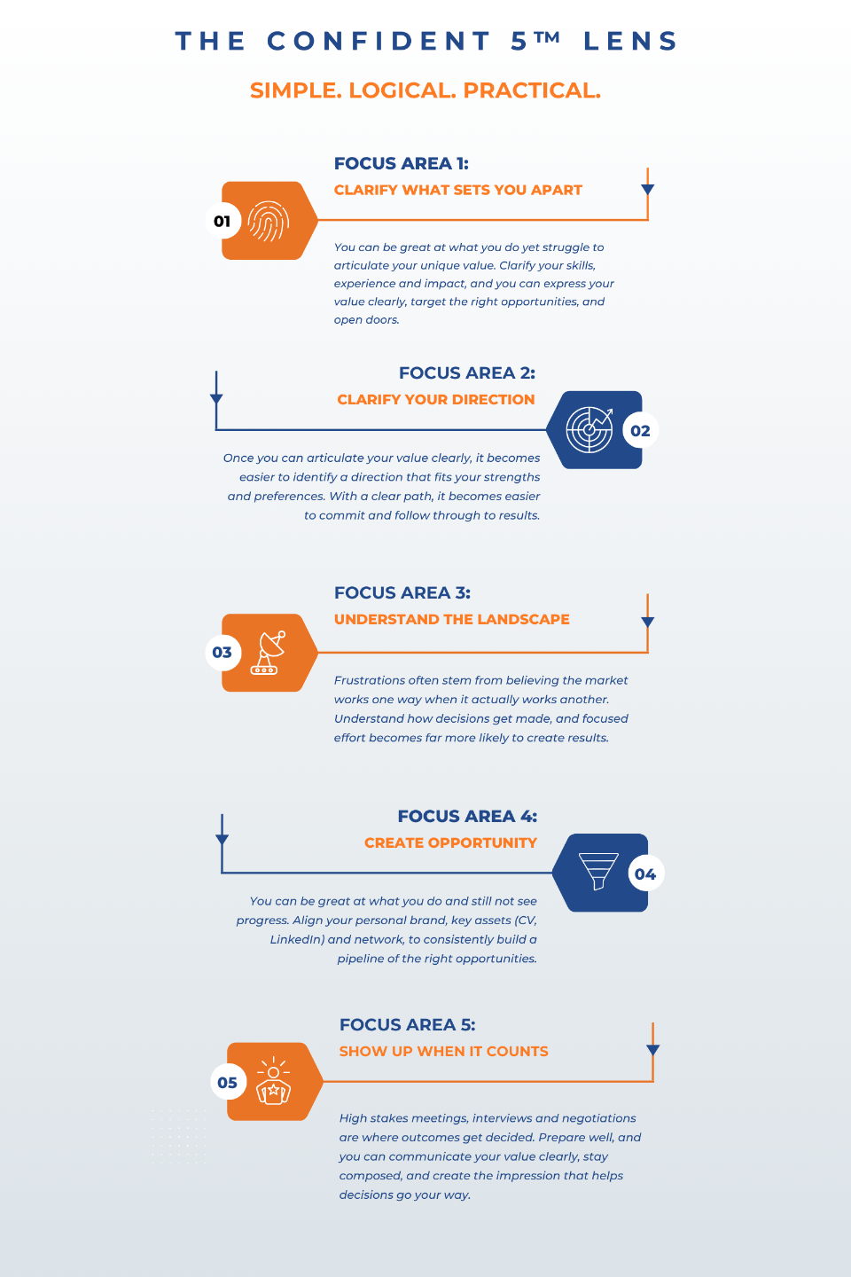 The Confident 5™ Lens is a simple, handy guide that plays a part in how we work together, used early to structure thinking and agree priorities, before we do a deeper dive into the specific areas that matter most.